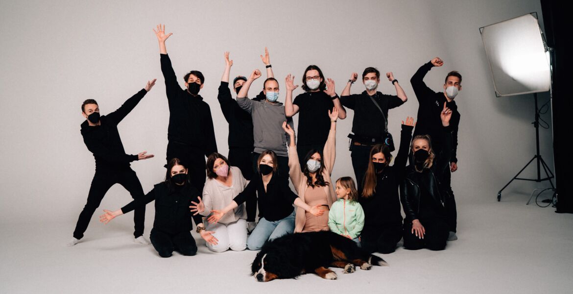 Unsere erste Wahl für den Drehort: Die hangar-Studios in Berlin-Adlershof. 500 m2 Studiofläche, eine große Hohlkehle und tipptopp Ausstattung - z.B., um Dolly-Schienen für Kamerafahrten zu verlegen. Denn davon brauchten wir gleich zwei, um alle Einstellungen aus dem Skript drehen zu können. Bereits am Tag vor den eigentlichen Dreharbeiten, wurde es ernst für uns: Gemeinsam mit unseren Kollegen von FORTSCHRITTE FILM aus Leipzig, die uns bei der Produktion unterstützt haben, sind wir mit zwei vollbeladenen Sprintern nach Berlin aufgebrochen, um schon mal sämtliche Requisiten (allen voran das Sofa!) und die umfangreiche Lichttechnik vor Ort "in Stellung zu bringen". Das war Schwerstarbeit! Hat aber im Team super funktioniert und wir hatten viel Spaß dabei. Corona-regelkonform versteht sich, denn auch darauf galt es natürlich zu achten. So bestand vor Ort während unseres gesamten Aufenthalts ein striktes Hygienekonzept für alle Beteiligten. Zu denen gesellten sich dann am Drehtag auch noch das restliche Produktionsteam, inkl. Makeup-Artists und unsere fünf Schaupielerinnen und Schauspieler nebst Hund. Da war ganz schön was los am Set!