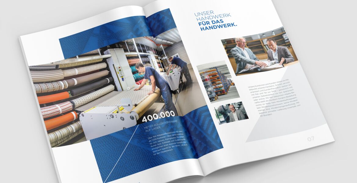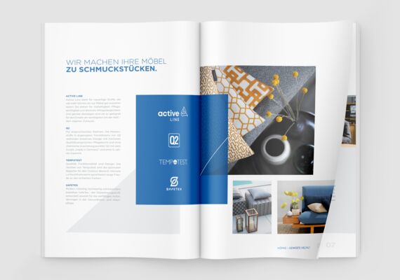 Mit klaren, reduzierten Elementen werden die hochwertigen Stoffe in Bild und Text in Szene gesetzt, die Gestaltung versteht sich dabei immer als unterstützendes Element von Informationen und verleiht diesen stets eine gut sichtbare Zugehörigkeit zum Unternehmen, sowohl im Print-, als auch im Webbereich.